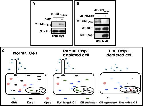 Figure 8. Regulation of Gli21-799, an analogue Gli2 mutant of zebrafish Yot, by Dzip1 and Spop. (A) Western blot results showing that knockdown of Dzip1 stabilized Gli21-799 in Xenopus embryos. RNAs encoding Gli21-799 and MT-GFP were injected into controls and embryos that had received a prior injection of DMO. Embryos were harvested at the neurula stage and subjected to Western blotting. MT-GFP served as an injection and loading control. (B) Forced Spop expression decreased the protein stability of Gli21-799. MT- Gli21-799 and MT-GFP were transfected alone, or in combination with MT-Spop into NIH3T3 cells. Cell lysates were subjected to Western blot with the anti-myc antibody to detect the levels of Spop. (C) Model of Dzip1 functions during Hh signaling. Dzip1 supports ciliogenesis and maintains the proper expression level of Gli proteins through controlling the stability of Spop (left panel). Partial knockdown of Dzip1 has no effect on the formation of cilia, but induces degradation of Spop, leading to increased levels of Gli proteins. When exposed to Shh, these cells produce more Gli activators, resulting in a more robust Hh target gene expression (middle panel). When Dzip1 is depleted more completely, ciliogenesis is disrupted. Although these cells have increased levels of Gli, they cannot receive Shh. This prevents the formation of Gli activators. Consequently, gene expression induced by Shh is inhibited (right panel). Under normal conditions, cells located at a distance from the source of Shh are not exposed to Shh. Whether these cells form cilia or not are not important. However, when Dizp1 is depleted, destabilization of Spop will induce accumulation of full-length Gli proteins (not Gli activators). This will lead to weak ectopic Hh target gene expression in embryos.