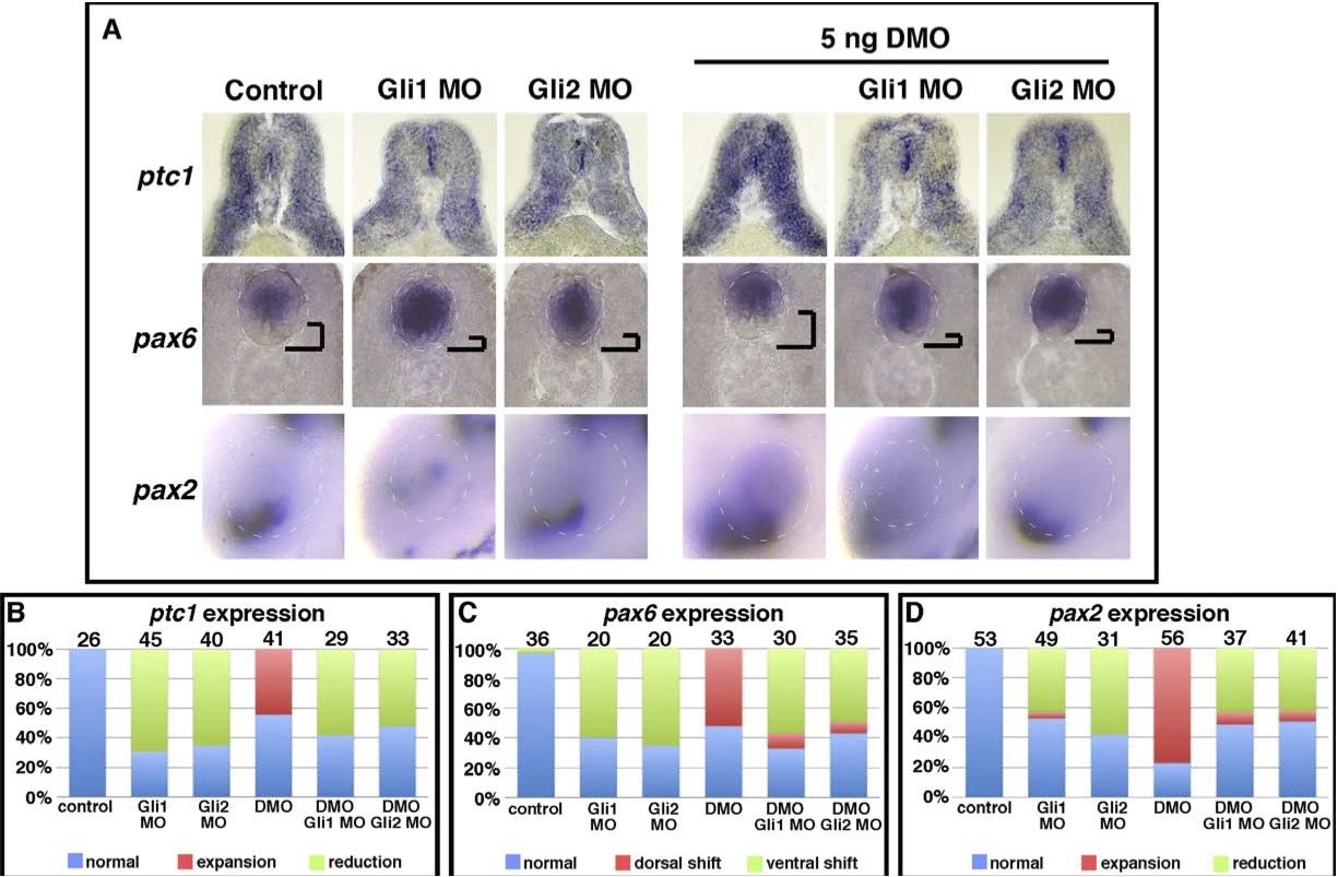 Figure 4. Knockdown of Gli1 or Gli2 rescues phenotypes induced by partial depletion of Dzip1. (A) Whole mount in situ hybridization of ptc1 (top), pax6 (middle) and pax2 (bottom) in controls and embryos either receiving a single injection of Gli1 MO, Gli2 MO, or DMO, and double knockdown embryos injected with Gli1 MO/DMO or Gli2 MO/DMO. In the middle panels, the distance between the floor plate and the ventral border of the pax6 expression domain was highlighted. (B-D) Summary of ptc1 expression phenotypes (B), pax6 expression phenotypes (C) or pax2 expression phenotypes (D) in controls and the different groups of embryos receiving either a single or double morpholino injection against Gli1, Gli2 or Dzip1.