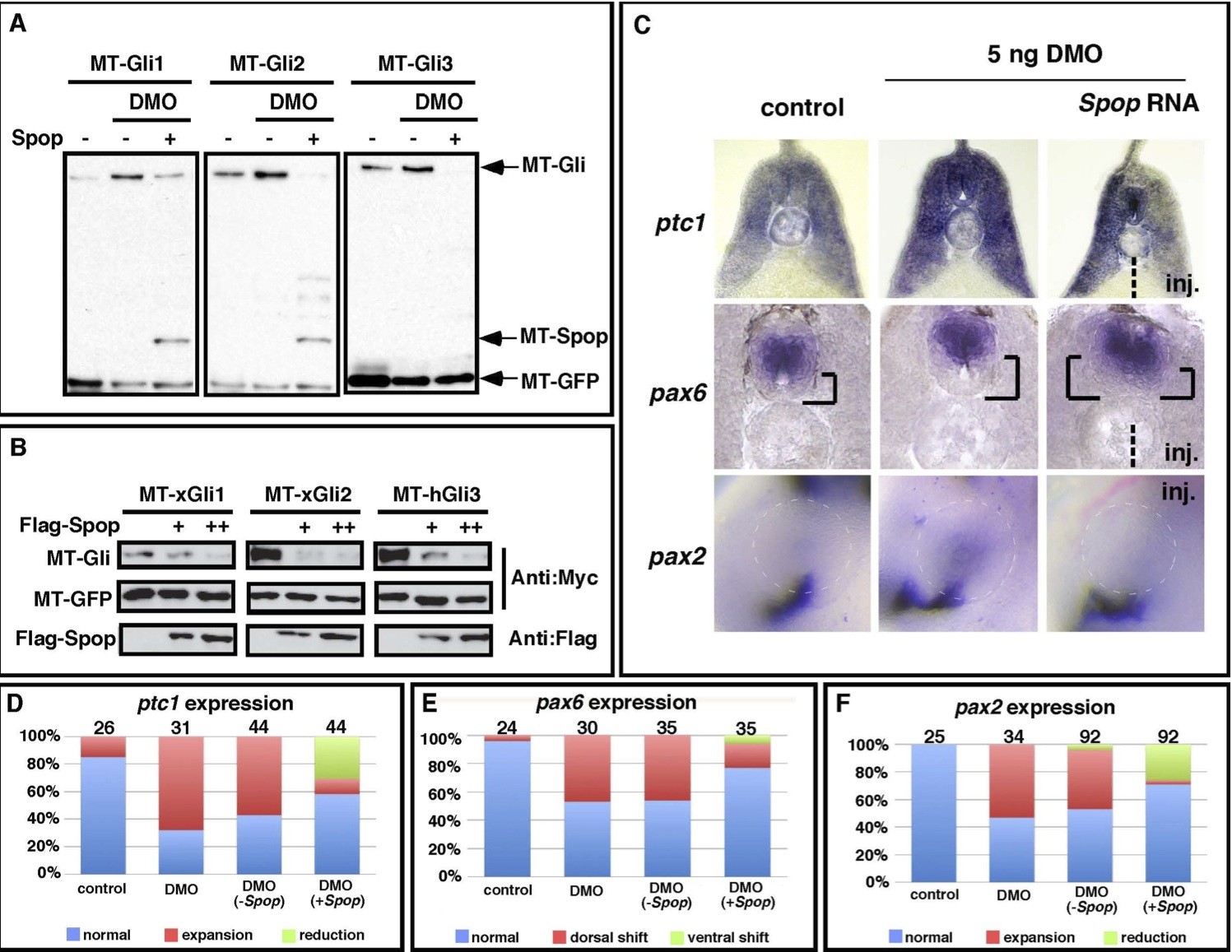 Figure 7. Overexpression of Spop rescues phenotypes caused by partial knockdown of Dzip1. (A) Western blot results showing that increases to Gli stability following Dzip1 depletion were reversed by Spop overexpression. RNAs encoding MT-Gli1-3 (2 ng) and MT-GFP (50 pg) were injected, alone, or in combination with MT-Spop (100 pg) into controls or embryos that had received a prior injection of DMO. Embryo were harvested at the neurula stage and subjected to Western blot with the anti-myc antibody to detect the levels of Spop. (B) Forced Spop expression decreases the stability of xGli1, xGli2, and hGli3 in NIH3T3 cells. NIH3T3 cells were transfected with MT-Glis and MT-GFP, alone, or in combination with increasing levels of MT-Spop. Western blots were carried out with the cell lysates to determine the levels of Gli1, 2 and 3. GFP serves as a transfection and loading control. (C) In situ hybridization results showing the expression of ptc1, pax6, and pax2 in controls or embryos injected with DMO alone or DMO and Spop RNA. �inj� indicated the side which received Spop RNA injection. (D-F) Summary of the ptc1 (D), pax6 (E), and pax2 (F) expression phenotypes in controls and injected embryos.