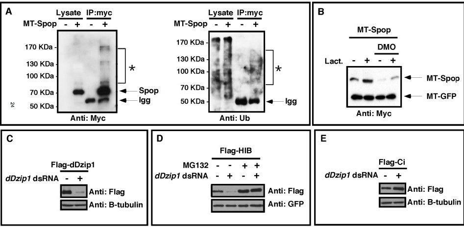 Figure 6. Dzip1 prevents ubiquitin/proteasome-dependent degradation of Spop/HIB. (A) Spop is ubiquitinated in vivo. MT-Spop was injected into Xenopus embryos. Spop protein was purified by immunoprecipitation using an anti-myc antibody. Lysates and immunoprecipitates from injected and uninjected embryos were subjected to Western blot with the anti-myc antibody (left panel) and anti-ubiquitin antibody (right panel). The unmodified MT-Spop band migrated to 68 kDa. A smear of high molecular weight proteins (*), migrating slower than unmodified MT- Spop, could be detected in both myc and ubiquitin Westerns. (B) MT-Spop was injected into control or embryos that had received a prior injection of DMO. Animal caps were dissected at stage 9. Subsequently, caps were cultured in media with or without 2μg of lactacystin. Animal caps were harvested at stage 15 and subjected to Western blot to detect the levels of Spop. (C) Western blot results showing severe reduction of Flag-dDzip1 by dDzip1 dsRNA in S2 cells. �- tubulin serves as a loading control. (D) Dzip1 knockdown promoted proteasome-dependent degradation of HIB in S2 cells. S2 cells were cotransfected with Flag-HIB and GFP constructs and treated with dDzip1 dsRNA and/or MG132. Cell extracts were subjected to Western blot with the anti-Flag antibody to detect the levels of HIB. GFP serves as transfection and loading control. (E) Dzip1 knockdown promotes Ci stability in S2 cells. S2 cells were transfected with Flag-Ci and treated with dDzip1 dsRNA. Western blots were carried out with the cell lysates to determine the levels of Ci. Tubulin serves as a loading control.