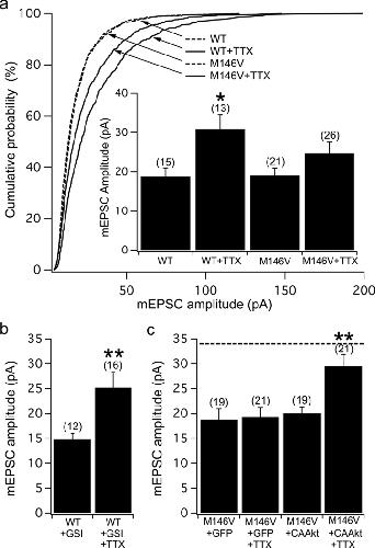 Figure 2. PS1M146V neurons display synaptic scaling deficits that can be rescued by expression of constitutively active Akt(a) Cumulative probability plot showing the distribution of mEPSC amplitudes from wild-type (WT) and PS1M146V (M146V) control and TTX-treated neurons; (inset) average mEPSC amplitudes of the same neurons. Notice that TTX treatment failed to induce a significant increase in mEPSC amplitudes in PS1M146V neurons (ANOVA, P < 0.02; *Bonferroni’s Multiple Comparison Test, P < 0.05). (b) γ-secretase inhibitor (GSI) did not affect scaling up of mEPSC amplitudes in TTX-treated wild-type neurons (**unpaired t-test, P < 0.01). (c) Virally-mediated expression of CA-Akt in PS1M146V neurons had no effect on mEPSC amplitudes on its own, but restored the ability to scale up in response to TTX (ANOVA, P < 0.001; **Bonferroni’s Multiple Comparison Test, P < 0.01). Dashed line shows the average mEPSC amplitude of TTX-treated wild-type neurons (reported in Fig. 1b). All error bars, s.e.m.