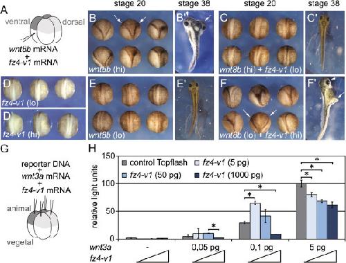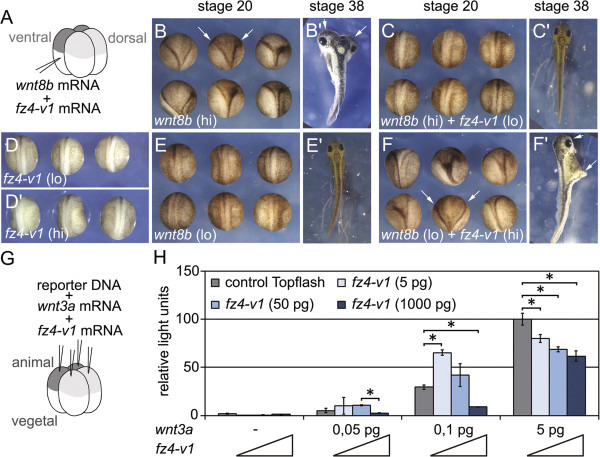 Figure 1. Fz4-v1 has a biphasic, dose-dependent activity in modulating Wnt/β-catenin-dependent signalling. (A-F) 4-cell stage embryos were injected on the ventral marginal side with 0.5 pg wnt8b RNA (lo) or 10 pg (hi) alone, or in combination with 250 pg fz4-v1 RNA (lo) or 1000 pg (hi) or with 250 pg (lo) or 1000 pg (hi) fz4-v1 RNA alone. Formation of secondary body axes was scored at neurula (st. 20, B-F) and tadpole stages (st. 38, Bâ-Fâ). Frequency of secondary axis formation: (B, Bâ) 71.9% (nâ=â36), (C, Câ) 0% (nâ=â24), (D, Dâ) 0% (nâ=â20), (E, Eâ) 0% (nâ=â24), (F, Fâ) 54.2% (nâ=â24). (G) At the 4-cell stage blastomeres were injected in the animal region with 80 pg Topflash-Luciferase reporter plasmid in combination with wnt3a RNA (0.05 pg, 0.1 pg, 5 pg) and fz4-v1 RNA (5 pg, 50 pg, 1000 pg). (H) Luciferase activity was measured at gastrula stage (st. 11). Error bars represent standard deviation (SD). (*) indicates significant difference (Studentâs t test, pâ<â0.05).