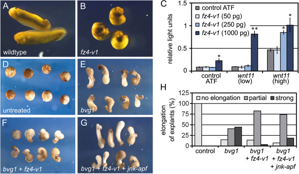 Figure 2. Fz4-v1 perturbs morphogentic movements by activation of the Wnt/β-catenin-independent JNK pathway. (A, B) Embryos were injected radially at the 4-cell stage with 1 ng fz4-v1 RNA. At tailbud stages (st. 25) 22% displayed spina bifida and neural tube closure defects (nâ=â45). (C) At the 4-cell stage 50 pg of the ATF-luciferase reporter plasmid was injected ventral-animally alone, or in combination with 100 pg (low) or 500 pg (high) wnt11 RNA and fz4-v1 RNA (5, 50 and 1000 pg). Reporter activity was analyzed at late gastrula stages (st. 12). Error bars represent SD. (*) indicate significant difference to control or wnt11 alone, respectively (grey bars) (Studentâs t test, *pâ<â0.05, **pâ<â0.001). (D-H) 4-cell stage embryos were injected at the animal pole region with bvg1 RNA (100 pg) alone, or in combination with fz4-v1 (600 pg) and jnk-apf (1 ng). At blastula stages (st. 9) the caps were explanted and elongation was scored at stage 25. (D) Non-injected controls (nâ=â20) showed no elongation but bvg1-injected explants (E) did (nâ=â27). (F) Co-injection of fz4-v1 partially inhibited explant elongation (nâ=â29), which was restored by JNK-APF (nâ=â27) (G). (H) Quantification of the animal cap experiments.