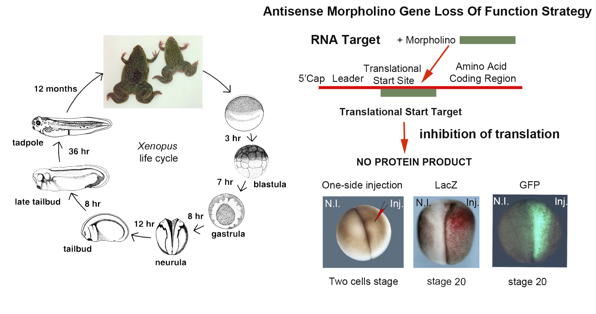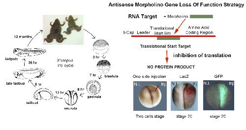 Fig. 1. Xenopus laevis as a model system to study gene function. On the left, the life cycle of Xenopus laevis. On the right, the gene loss of function strategy that specifically blocks the translation of a gene of interest by microinjecting spe- cific morpholino oligos in one side of the embryo. Antisense morpholino is targeted to se- quences close to the translation start site. The injected side is visualized by the co-injection of a reporter mRNA such as LacZ or GFP. Examples of chromogenic reaction for beta galactosidase (red) and GFP (green fluorescence) are shown in neural stage embryos.