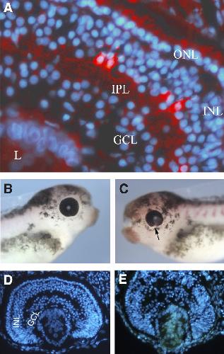 Fig. 4. Role of serotonergic signaling during eye development. (A) Se- rotonergic amacrine cells in Xenopus stage 42retina (red immunostaining). (B-E) Effects of 5-HT2B morpholino injection on Xenopus eye development. Lateral (B,C) views of control and injected side of the same tadpole (st. 42). The arrow in (C) points to the optic fissure that fails to close ventrally. (D,E) Hoechst nuclear staining (blue) of cryostat eye cross-sections of control and morpholino-injected stage 42tadpole: note the altered retinal layering in (E). ONL, outer nuclear layer; INL, inner nuclear layer; IPL, inner plexiform layer; GCL, ganglion cell layer; L, lens.