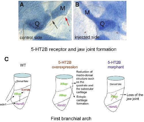 Craniofacial skeletal alterations in 5-HT2B morphants (st. 49). Alcian blue staining of a flat mount embryo showing the jaw joint region of the control (A) and injected (B) side. The jaw joint (black arrow in the control side) is lacking in the injected side; note also the reduction of the quadrate (Q) and the absence of the ventral cartilaginous muscular process of the Meckel�s cartilage, which is present in the control side (red arrow). Q, quadrate; M, Meckel�s cartilage. (C) Scheme of the role of the 5HT-2B receptor signaling in patterning the dorso-ventral axis of the first branchial arch. The scheme is based on the experimental data reported in Reisoli et al., 2010. 5-HT2B receptor signaling is both sufficient and necessary to induce and maintain Xbap (Nkx2.2) gene expression in the medial region of first branchial arch giving rise to the jaw joint, possibly cooperating with endothelin receptor signaling.