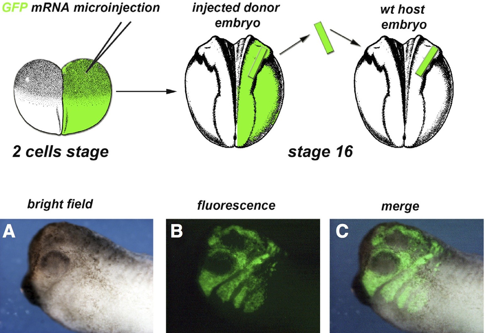 Fig. 2. Neural crest cell transplantation assay. Top: Scheme of the cranial NCCs transplant assay at neurula stage (st. 16). (A,B,C) Lateral views of an early tailbud (stage 28) transplanted embryo: (A) bright field; (B) GFP fluorescence in transplanted cranial NCCs; (C) merge.