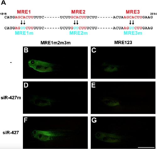 Fig. 3. Degradation of DEADSouth mRNA via MREs in region A of the 3â² UTR. (A) Sequences of wild type (upper) and mutated MREs (lower). Three possible MREs in region A were mutated (MRE1m2m3m). (BâG) MRE123 or MRE1m2m3m reporter mRNA was injected without/with siR-427 or siR-427m into the animal hemisphere of fertilized eggs. The embryos at 41 were examined for degradation of injected mRNA by Venus fluorescence. Note that the MRE1m2m3 m reporter mRNA was degraded specifically by siR-427m, but not by siR-427. Scale bar, 1 mm. |