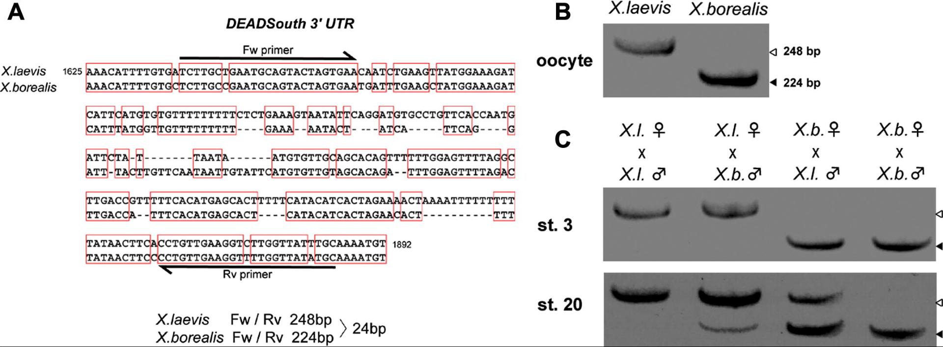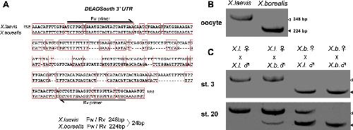 Fig. 5. Zygotic expression of DEADSouth gene. (A) Sequence alignment of the 3â² UTR of DEADSouth cDNA of X. laevis (DDBJ/GenBank/EMBL accession No. AF190623 nucleotides 1625â1892) and X. borealis. PCR primers are indicated with arrows. PCR using these primers resulted in species-specific amplification of 248 and 224 bp sequences from X. laevis and X. borealis, respectively. (B) Species-specific amplification using cDNA from X. laevis or X. borealis oocytes as a template. (C) Expression of DEADSouth gene in hybrid embryos between X. laevis and X. borealis at stages 3 and 20. X. laevis- and X. borealis-specific amplifications are indicated by open and closed arrowheads, respectively, in (B) and (C). Note that the DEADSouth transcript from the male was detected only in stage 20 embryos. |