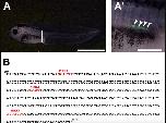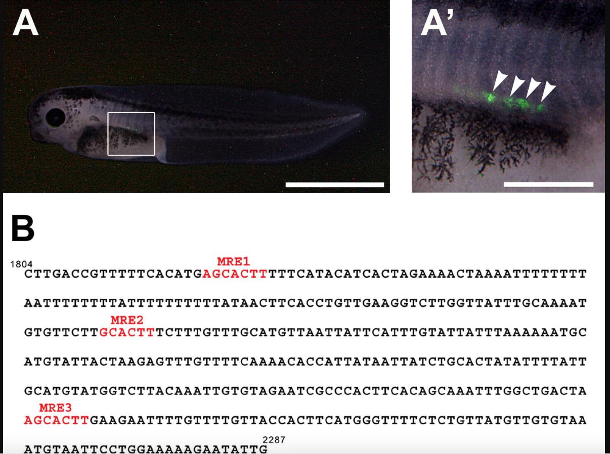 Fig. 1. Expression pattern of venus fused with region A of DEADSouth 3â² UTR in the middle of 3â² UTR of Xenopus β-globin (A and Aâ²) and the sequence of region A (B). (A) Whole-mount lateral view of stage 41 tadpole. Scale bar: 1 mm. (Aâ²) High-magnification of the area indicated in (A). Arrowheads indicate PGCs. Scale bar: 250 μm. (B) The possible target sites for miR-427 (MRE, in red) found in the region A of DEADSouth 3â² UTR (DDBJ/GenBank/EMBL accession No. AF190623 nucleotides 1804â2287). |
