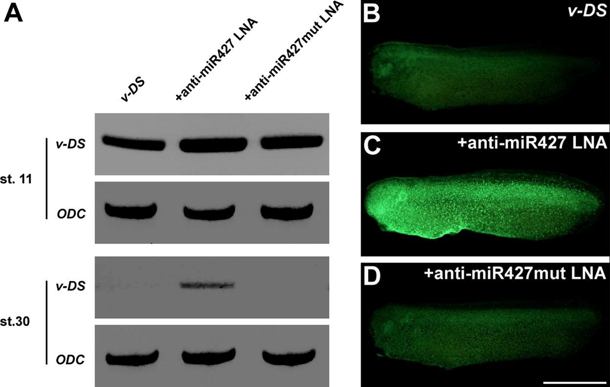 Fig. 2. DEADSouth mRNA was degraded specifically by miR-427. (A) RT-PCR for v-DS mRNA in embryos at stages 11 and 30 coinjected with anti-miR427 LNA or anti-miR427mut LNA. The ubiquitously expressed ODC gene was used as a control. Note that the injected v-DS mRNA was detected in every embryo at stage 11, but detected only in embryos coinjected with anti-miR427 LNA at stage 30. (B) Expression of venus reporter mRNA at stage 30. (C) and (D) Expression of venus reporter mRNA at stage 30 in an embryo coinjected with anti-miR427 LNA or anti-miR427mut LNA. Note that Venus fluorescence was detected only in the embryos coinjected with anti-miR427 LNA. Scale bar, 1 mm. |