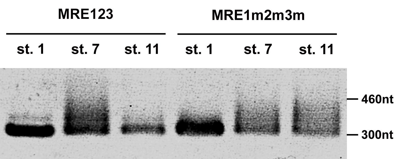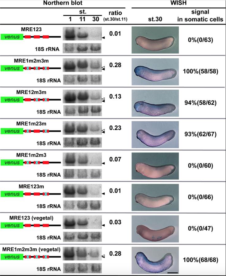 Fig. 4. Degradation of reporter mRNA with normal or mutated MREs. (left) Northern blot analysis for total RNA (10 μg/lane) at stages 1 (just after microinjection), 11 (gastrula) and 30 (tailbud). 18S rRNA bands are shown as loading controls (lower in each row). Closed and open arrowheads indicate sizes of the original and elongated mRNA, respectively. The ratios of band intensity at stage 30 to that at stage 11 are also shown. Each ratio was the mean of duplicated experiments. (right) WISH for venus mRNA in stage 30 embryos injected with the indicated mRNA. The percentage of embryos in which a Venus fluorescence signal was detected in the somatic cells is shown in the right. The lowest two rows show the results from the experiments in which MRE123 and MRE1m2m3m mRNAs were injected at the vegetal pole, respectively. Scale bar, 1 mm. |