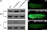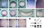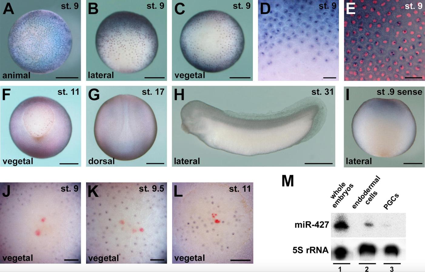 Fig. 6. Expression of miR-427 during early development in X. laevis. WISH with antisense (AâH) and sense LNA probes (I) for miR-427. Signals in blue (high) to brown (low) depended on the expression level. (AâC) Animal, lateral and vegetal views at stage 9, respectively. (D, E) High magnification images of the equatorial region of the stage 9 embryo. Nuclei are also stained with PI in (E). (F) Vegetal views at stage 11. (G) Dorsal view at stage 17. (H) (I) Lateral views at stages 31 and 9, respectively. (J, K, L) Vegetal views of WISH at indicated stages with antisense Xpat riboprobe (red) and antisense miR-427 LNA probe (blue). Note that signals for Xpat are not overlapped with those for miR-427. Scale bars are 0.5 mm in (AâC, F, G, I), 0.1 mm in (D, E), 0.2 mm in (JâL) and 1 mm in (H), respectively. (M) Northern blot analysis for miR-427. Total RNAs from whole embryos (0.5 μg), endodermal cells (1268 cells) and PGCs (1268 cells) at stage 17 were loaded into lanes 1, 2 and 3, respectively. After detection for miR-427 (upper), the blot was reprobed with a 5S rRNA probe for normalization (lower). |