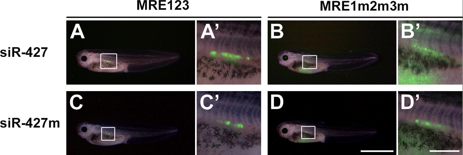 Fig. 7. Effect of siR-427 on the degradation of reporter mRNA in PGCs of stage 41 tadpoles. (AâD) Whole-mount lateral views are shown with injected reporter mRNA and siRNA. (Aâ²âDâ²) High-magnification of the areas including aligned PGCs indicated in (AâD), respectively. Scale bars, 1 mm in (D) and 500 μm in (Dâ²). |