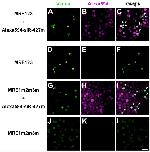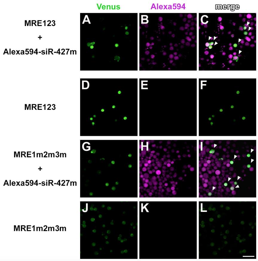 Supplementary Figure 2. Effect of siR-427 on the degradation of reporter mRNA in PGCs. (A–L) Dissociated endodermal cell masses are shown from stage 20-embryos injected with MRE123 plus Alexa594-labeled siR-427m (A–C), MRE123 only (D–F), MRE1m2m3m plus Alexa594-labeled siR-427m (G–I) and MRE1m2m3m only (J–L). The signals for siR-427m (purple) and Venus (green) overlap partially as indicated by white arrowheads. Scale bar, 250 μm. |