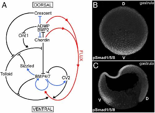 Fig. 1. A gradient of BMP activity patterns the D-V axis of the Xenopus gastrula. (A) BMP activity along the D-V axis results from a series of direct proteinâprotein interactions between Chordin and other partners (black arrows), transcriptional regulation (blue arrows), and protein flux (red arrows). The entire embryo participates in forming the BMP gradient, which results from the dueling activities of the dorsal and ventral signaling centers. (B) Transverse optical section at gastrula (stage 11) showing a ventral- (V) to-dorsal (D) gradient of BMP activity using anti-pSmad1/5/8 antibody as readout. (C) Gastrula (stage 11) embryo sectioned sagittally, showing higher BMP activity in the ventral animal cap and marginal zone nuclei as assessed by pSmad1/5/8 immunostaining. |