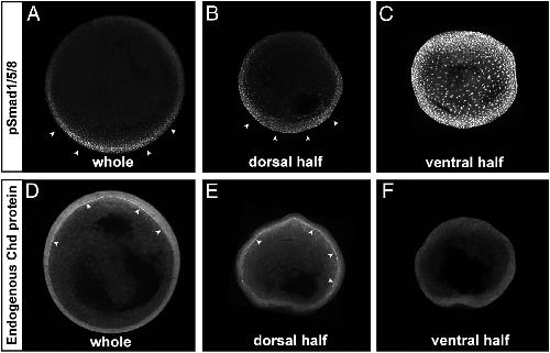Fig. 5. The Chordin and pSmad1/5/8 gradients self-regulate in dorsal half-embryos. The ventral side of albino embryos was marked at the 8-cell stage using the method described in Fig. S4. Embryos were bisected at stage 9, cultured until stage 12, fixed, and sectioned transversely. All embryos were siblings and images were processed identically. (AâC) pSmad1/5/8 immunostaining of whole embryo (A, n = 3), dorsal (B, n = 6) or ventral (C, n = 3 of 4 showing the phenotype) half-embryos. Note that the BMP gradient was reestablished in the dorsal half-embryo, while very strong uniform pSmad1/5/8 was present in the ventral half-embryo. (DâF) Chordin immunostaining of whole embryo (D, n = 3), dorsal (E, n = 10) or ventral (F, n = 7) half-embryo. The Chordin gradient was regenerated in the Brachetâs cleft of dorsal half-embryos (in 8 of 10), while no Chordin expression was detected in the ECM of the ventral half-embryo (in 6 of 7). Similar results were obtained in two independent experiments. |