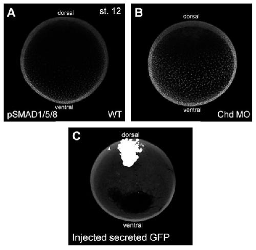 Fig. S1. Chordin (Chd) depletion increases the BMP signaling (D-V) gradient. (A and B) pSmad1/5/8 immunostainings of injected embryos at stage 12 sectioned transversely between the animalâvegetal axis. pSmad1/5/8 signal is increased in the ventral side in Chd morpholino oligo (MO)-injected embryos (n = 6) compared with wild type (WT) (n = 6). (C) A secreted form of GFP does not diffuse in Brachetâs cleft (arrowhead) after overexpression (n = 5); this indicates that the observed long-distance diffusion of BMPâGFP fusions (zADMP-GFP and xBMP2-GFP) in Brachetâs cleft requires the BMP moiety. ADMP, anti-dorsalizing morphogenetic protein. |