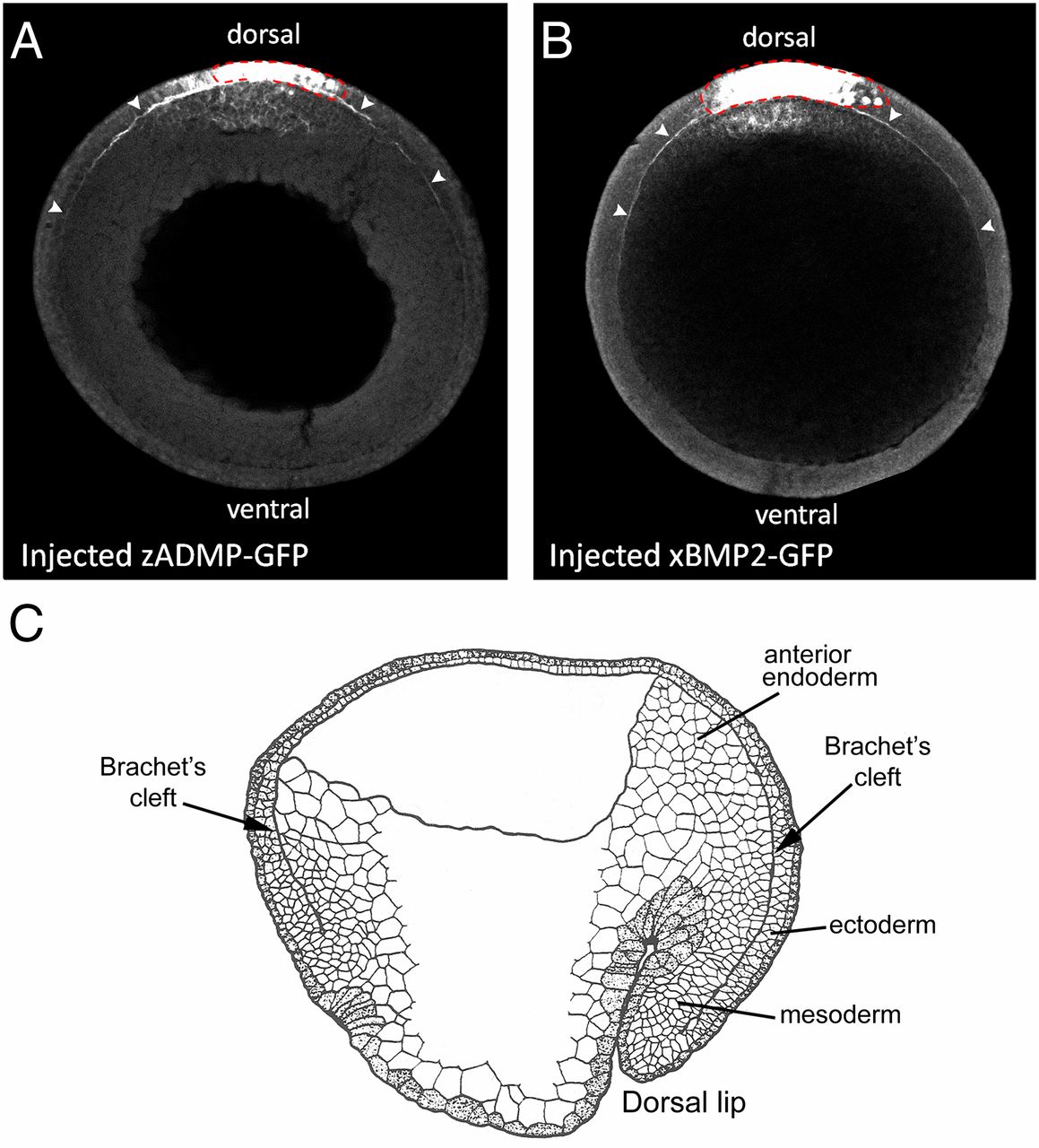 Fig. 2. Overexpressed BMP-GFP fusion proteins diffuse in Brachetâs cleft. (A and B) Dorsally expressed zADMP-GFP and xBMP2-GFP fusion proteins diffuse within the narrow confines of Brachetâs cleft (marked by arrowheads) away from the point of mRNA injection in ectodermal cells (indicated by a red dotted line) (n = 7 and n = 6, respectively). GFP fusion proteins were detected by GFP immunostainings of transverse optical sections of stage-12 embryos through the animalâvegetal axis. (C) Diagram of stage-12 sagittal section of a Xenopus embryo (after P. Nieuwkoop, ref. 38). Brachetâs cleft is the narrow cavity that separates the mesodermal and anterior endodermal layers from the ectoderm and encircles the entire D-V axis. |