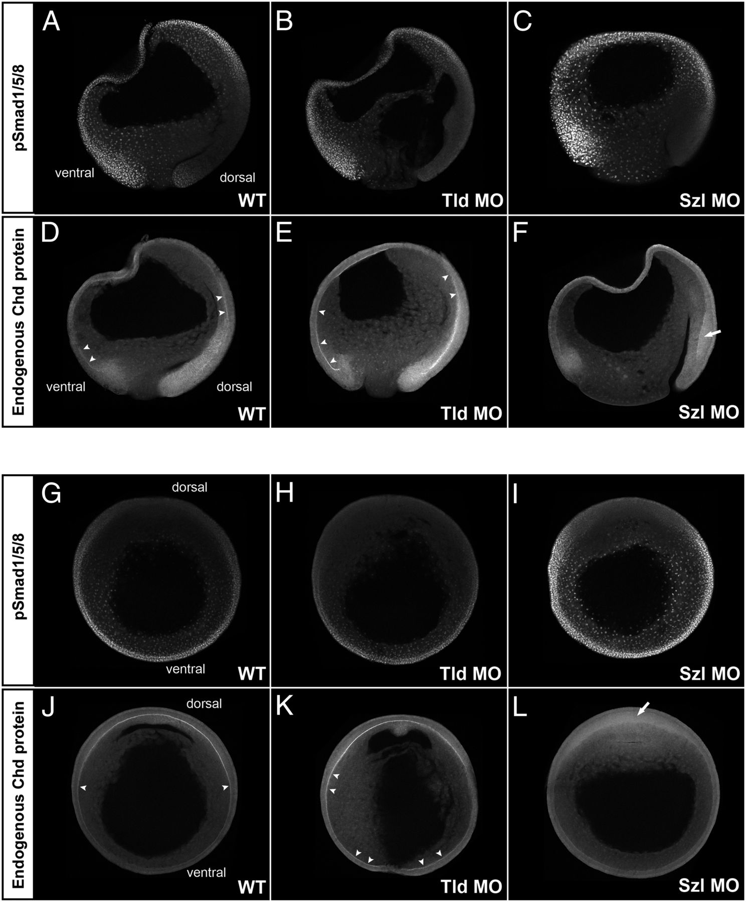 Fig. 4. Analysis of BMP signaling and Chordin protein localization in embryos depleted of Tolloid (Tld MO) or Sizzled (Szl MO). All embryos were siblings allowed to develop for the same period; all images were processed identically. (AâF) pSmad1/5/8 (Upper) and Chordin (Lower) immunostainings of sagittal optical sections. The gradient of BMP activity was complementary to that of Chordin localization in WT embryos (Left, n = 6 and n = 4, respectively). When translation of the Chordin-degrading enzyme Tolloid was inhibited in Tld MO-injected embryos (Center, n = 5 and n = 3, respectively), BMP activity was decreased on the dorsal side and increased accumulation of Chordin was observed in Brachetâs cleft (arrowheads). Conversely, when Sizzled was depleted (Szl MO), BMP activity (nuclear pSmad1/5/8) was greatly increased in the embryo, and Chordin failed to accumulate in the Brachetâs cleft (Right, n = 3). Diffuse accumulation of Chordin in dorsal ectoderm is indicated by the arrow. (GâL) pSmad1/5/8 (Upper) and Chordin (Lower) immunostainings of embryos sectioned transversely through the animalâvegetal axis at late gastrula (stage 12). pSmad1/5/8 staining was decreased in Tld MO embryos (H, n = 6) and increased in Szl MO embryos (I, n = 4) compared with WT (G, n = 6). Tld MO increased (K, n = 7) and Szl MO decreased (L, n = 5) Chordin staining in Brachetâs cleft compared with WT (J, n = 7). |