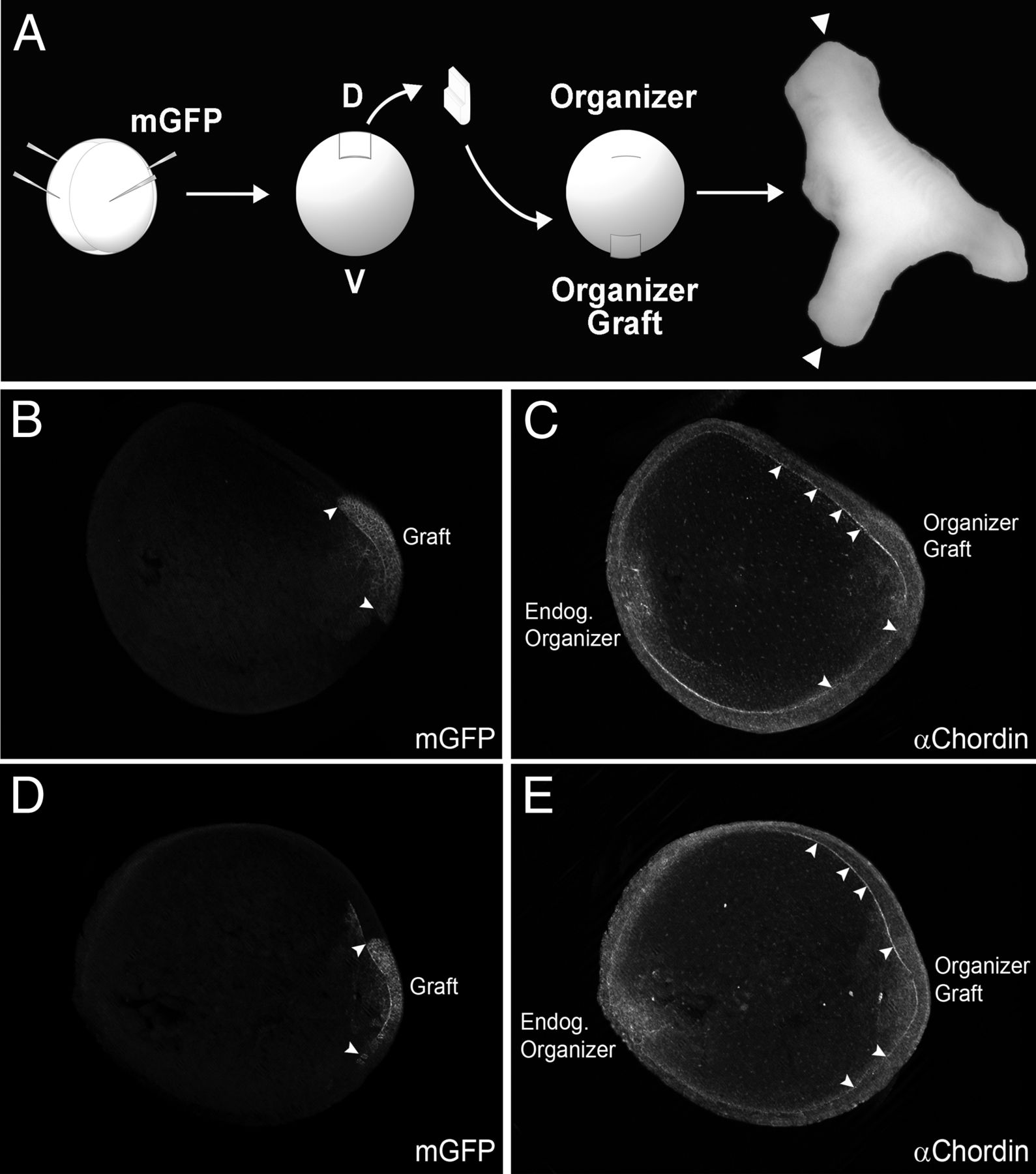 Fig. 6. Chordin protein diffuses long-range in Brachetâs cleft of embryos transplanted with Spemann organizer tissue. (A) Diagram of experimental procedure. mGFP was injected in the donor embryo (four injections at the four-cell stage) to trace the lineage of grafted tissue. Secondary axes were complete (with heads, indicated with arrowheads in this photograph) in 75% of the cases (n = 6/8). (BâE) Two embryos transplanted at stage 10 and fixed at stage 12 stained with GFP and Chordin antibodies are shown in optical transverse sections. B and D show localization of the grafted organizer tagged with mGFP; borders are indicated by arrowheads. In C and E, a second gradient of Chordin was observed, with Chordin protein staining in Brachetâs cleft extending a considerable distance from the graft (arrowheads) (n = 19). This indicates that Chordin protein diffuses from the graft through Brachetâs cleft. |