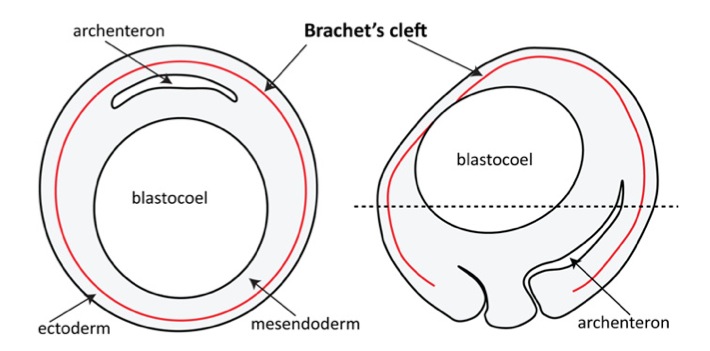 Fig. S2. Schematic drawing of the anatomical structures observed in the embryos shown in Fig. 3. On the left, diagram of stage-12 embryo sectioned transversely between the animal–vegetal axis. On the right, a sagittally sectioned embryo; the dotted line indicates the plane of section used in the transverse sections shown throughout this study. Note that the archenteron cavity (definitive gut) provides an excellent reference point for the dorsal side. The red line indicates the Fibronectin-rich extracellular matrix (ECM) that separates the ectodermal and endomesodermal layers, called the “Brachet’s cleft” in Xenopus. |