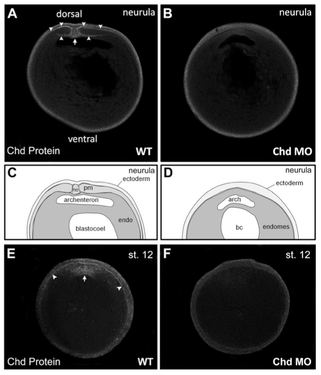 Fig. S3. The Chordin antibody staining of ECM is specific. (A) Immunostaining with Chordin antibody of neurula (stage 14) wild-type (WT) embryo sectioned transversely. Signal is observed on the dorsal side in the notochord (where Chordin is transcribed, arrow) and in the spaces separating the presomitic mesoderm (pm) from ectoderm (upper arrowheads) and dorsal endoderm (lower arrowheads), in regions where Chordin is not actively transcribed (n = 7). (B) Transverse section of Chordin-depleted embryo at neurula (Chd MO) stained with Chordin antibody. Note that the lack of signal in ECM indicates that anti-Chordin staining is specific (n = 5). (C and D) Diagrams of the anatomical structures seen in neurula stage WT or Chd MO-injected embryos shown in A and B, re- spectively. Arch, archenteron; bc, blastocoel; endomes, endomesoderm; no, notochord. (E) Chordin staining in transverse section of WT embryo (n = 5) showing Chordin protein in Brachetâs cleft (arrowheads) and dorsal mesoderm (arrow). (F) Immunostaining of stage-12 embryo injected with Chd MO showing that Chordin signal was eliminated in both dorsal mesoderm and Brachetâs cleft, confirming the specificity of the antibody; note that some background staining remains in the ectoderm (n = 5). |