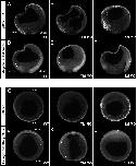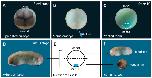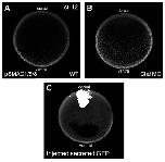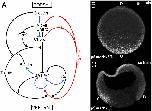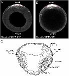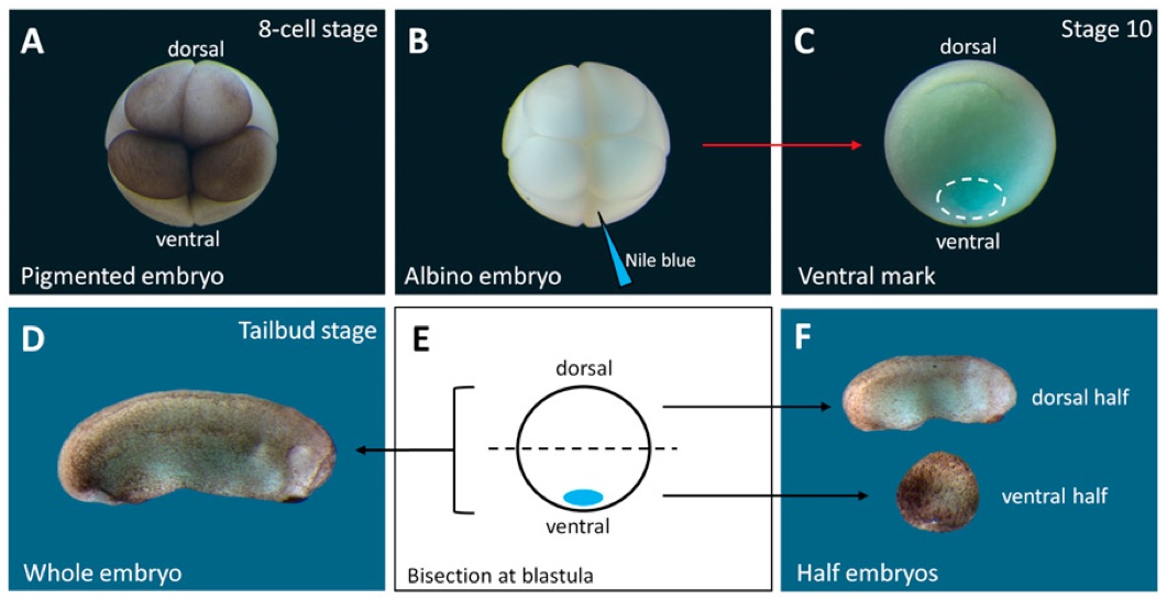 Fig. S4. The D-V polarity of the embryo can be predicted from the shape of the animal blastomeres at the eight-cell stage. Use of the vital dye Nile Blue sulfate allows marking of the ventral side of an albino embryo in preparation for bisection at blastula. (A) Animal (top) view of a pigmented eight-cell embryo showing the shape of the ventral cells spreading in a butterfly pattern and dorsal cells extending toward the equator. (B) A similar cell-shape pattern was observed in albino embryos, allowing a ventral blastomere to be marked with 20 mg/mL Nile Blue sulfate. (C) This pattern allows reliable marking of the ventral (or dorsal) side at the eight-cell stage as illustrated by this stage-10 embryo showing a ventral Nile Blue mark. (DâF) Bisection experiment in which pigmented or albino embryos were bisected at the blastula stage into dorsal and ventral halves (pigmented embryos are shown here). The dorsal half rescales to form a smaller but perfectly patterned embryo, whereas the ventral half lacks axial structures. In albino bisected embryos, all presumptive dorsal halves formed an axis (n = 20), whereas in presumptive ventral halves, only one (n = 12) formed an axis. The amount of Nile Blue sulfate should be kept to a minimum as it can quench fluorescence. Although Nile Blue sulfate was used in this study, other lineage tracers may be preferable in future studies. |