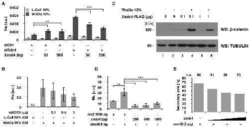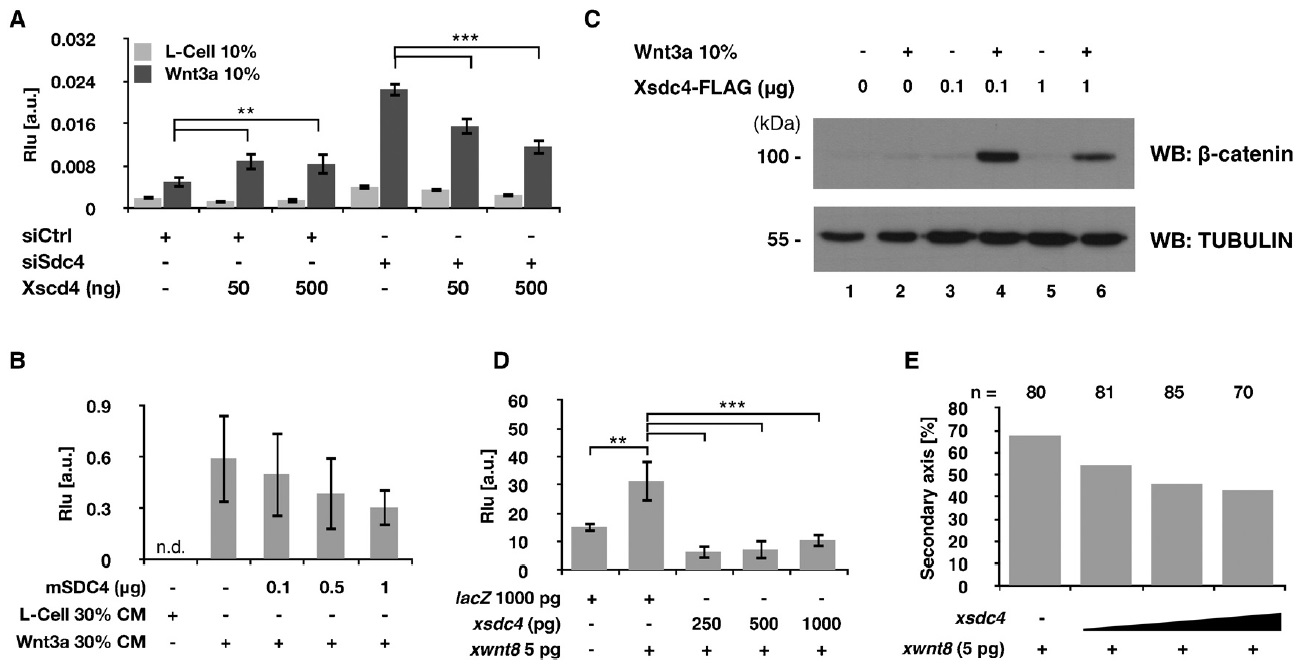 Fig. 2. SDC4 overexpression inhibits Wnt/-catenin signaling. (A) HeLa cells were co-transfected with Xsdc4 and siCtrl or siSdc4. Note that Xsdc4 overexpression in siCtrl-transfected cells has a dominant-negative effect, which is avoided when endogenous SDC4 was reduced by siSdc4 cotransfection. **p < 0.01; ***p < 0.001, by two-way ANOVAfollowed by Bonferroni post hoc test. (B) MEFs from Sdc4 −/− mice were transfected with mouse SDC4 (mSDC4) at increasing concentrations. Cells were stimulated asindicated and the TOPFlash activity measured. A consistently decrease of TOPFlash activity was induced by mSDC4 overexpression in a concentration-dependent manner,albeit statistically significant differences were not observed because of the intrinsic heterogeneity of MEFs. (C) L-Cells were transfected with siCtrl, siSDC4 and Xenopus SDC4(Xsdc4-FLAG) as indicated, and -catenin stabilization after 1 h of stimulation with Wnt3a CM or control CM was evaluated. (D) Xenopus embryos were injected with theindicated mRNAs in the four animal blastomeres at the 8-cell stage and incubated until stage 10.5. Embryos were pooled and lysed, and TOPFlash activity was measured.**p < 0.01; ***p < 0.001, by one-way ANOVA followed by Tukey post hoc test. (E) Xenopus embryos were injected with the indicated mRNAs in one ventral-vegetal blastomereat the 4-cell stage, and then incubated until neurula stages and secondary axis formation was measured. The graph represents the percentage of embryos with secondaryaxis in each treatment (secondary axis, [%]). n indicates the number of injected embryos, from three independent experiments. WB, Western Blot. |