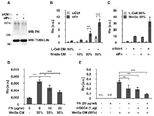 Fig. 3. Fibronectin (FN) loss-of-function enhances Wnt/-catenin signaling. (A and B) FN knockdown using siRNA (siFn; A) enhances TOPFlash activity in response to increasingconcentrations of Wnt3a CM (B). **p < 0.01, ***p < 0.001, by two-way ANOVA followed by Bonferroni post hoc test (B). (C) siFn and siSdc4 have a cooperative effect on TOPFlashactivity, compared with each siRNA transfected separately, in HEK293 cells. (D) Culture of cells upon recombinant FN decreases Wnt/-catenin signaling; in HeLa cells in aconcentration-dependent manner. *p < 0.05, ***p < 0.001, by one-way ANOVA followed by Tukey post hoc test. (E) MEFs from Sdc4 −/− mice were stimulated with Wnt3a CMand treated as indicated. Both culture of MEFs upon recombinant FN, or rescue of mouse SDC4 (mSDC4) expression, decreased Wnt/-catenin signaling (see bars 4–5). Bothtreatments combined have a cooperative effect, further decreasing TOPFlash activity (bar 6). **p < 0.01, ***p < 0.001, by one-way ANOVA followed by Tukey post hoc test; n.d.,not detected. WB, Western Blot. |