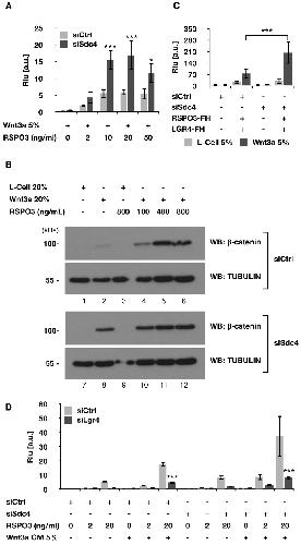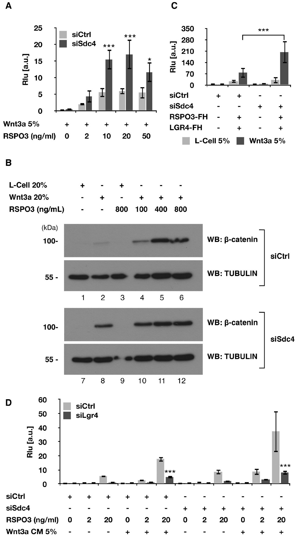 Fig. 5. Enhanced canonical activity of R-spondin 3 (RSPO3) in response to SDC4 knockdown. (A) HEK293 cells were transfected with siSdc4 or control siRNA, and stimulatedwith low doses of Wnt3a CM and increasing concentrations of purified RSPO3. Knockdown of SDC4 increases the ability of RSPO3 to enhance Wnt/-catenin signaling. (B)L-Cells were transfected with siCtrl or siSdc4, and -catenin stabilization after 1 h of stimulation with Wnt3a CM, plus purified RSPO3 or vehicle, was visualized. (C) HEK293cells were co-transfected with Rspo3-Flag/HA (Rspo3-FH) and Lgr4-Flag/HA (Lgr4-FH) and the indicated siRNAs, and stimulated with low doses of Wnt3a CM. Knockdownof SDC4 enhances TOPFlash activity in response to RSPO3 plus LGR4. (D) Knockdown of the RSPO3 receptor, LGR4, abrogates the potentiation observed when SDC4 levelsare reduced. HEK293 cells were transfected as indicated, and stimulated with low doses of Wnt3a CM and increasing concentrations of purified RSPO3. *p < 0.05; **p < 0.01;***p < 0.001, by two-way ANOVA followed by Bonferroni post hoc test; WB, Western Blot. |