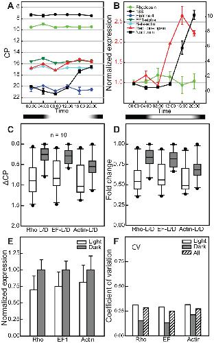 Figure 8. Expression level of rhodopsin transcripts at points in the light cycle. (A) Non-transgenic frogs were kept in 24 h (10D:14L) cycle and sacrificed at 4:00 hr time intervals and RNA extracted from eyes. Real-time PCR was used to quantify transcript levels using (A) PCR crossing point (CP) values. There is a slight increase in the transcript levels of rhodopsin, red cone opsin, and control genes, such as EF1-a and b-actin during the end of dark cycle. Black/white bar shows the dark/light periods (B) CP values normalized to housekeeping genes (see methods for details). The expression levels of rhodopsin and red cone opsin use the left axis scale while nocturnin uses the right Y-axis. The expression levels of rhodopsin, red cone opsin and nocturnin are shown. The expression of red cone opsin increased shortly after light onset, peaked a few hours afterwards and dropped in the dark. The expression of nocturnin increased before dark onset and peaked during the dark period and then returned to baseline. The expression level of rhodopsin, however, did not change significantly. (C, D) The expression levels of rhodopsin transcript and two control genes, EF1-a and b-actin, were determined during both a 24 hr light and 24 h dark cycle. The DCP (C) and fold change (D) in the light (L) and dark (D) values are shown as box plots. There is a higher expression level of all three genes during the dark cycle. The variation of the gene expression is much less during the dark cycle. (E) Expression levels normalized to 18S show ,30% increase in all three genes during the dark cycle. (F) The coefficient of variation in the expression level of genes is shown during the dark or light cycle and combined (All). doi:10.1371/journal.pone.0080059.g008 |