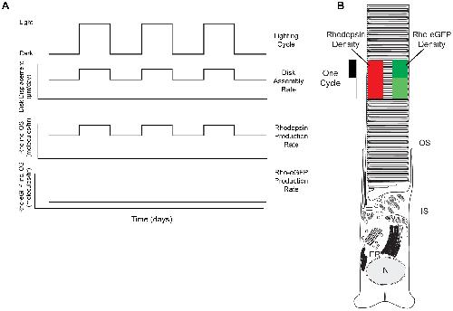Figure 11. Schematic diagram of light-regulated disk assembly. A. Rods housed in an alternating light-dark cycle (top panel) will vary the rate of disk assembly and displacement (second panel) in response to the phase of the cycle [6,7]. Since endogenous rhodopsin density in OS membranes is constant, the rate of rhodopsin incorporation (third panel) must change in phase with the lighting cycle and disk assembly. By contrast, Rho-eGFP appears to have a relatively constant rate of incorporation into the OS (bottom panel). This would then lead to a periodic variation in Rho-eGFP content, with higher densities assembled at night. B. Schematic diagram illustrating the density variation of Rho-eGFP (green) throughout a light cycle and the absence of variation in endogenous rhodopsin (red). The length of the lighting cycle and the size of the cell are not to scale. doi:10.1371/journal.pone.0080059.g011 |