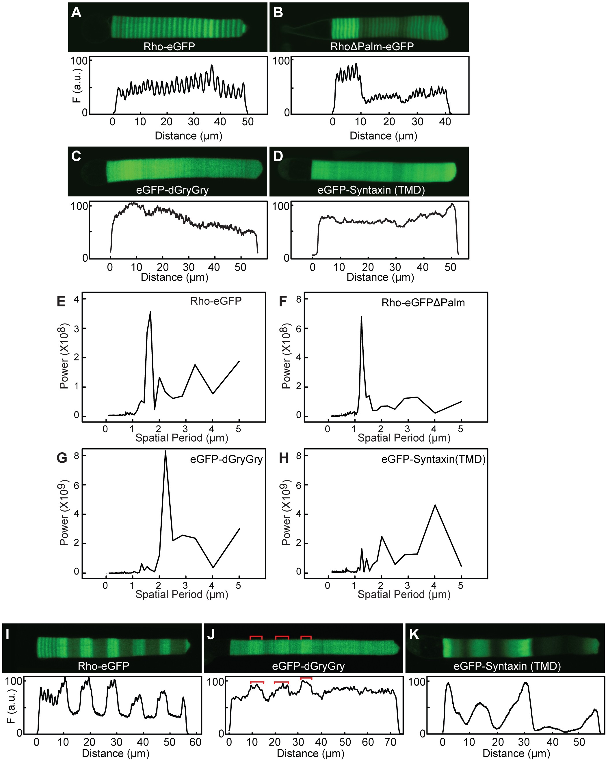 Figure 9. Axial variation of rhodopsin C-terminal mutants and membrane associated eGFP transgenes. Transgenic animals expressing the indicated transgene were housed in either a 24 h (12D:12L, AâD) or 168 h (84L:84D, IâK) light cycle. Representative cells and intensity profilesfrom animals housed in a 24 h (12D:12L) are shown. (EâH) Power spectra of the axial fluorescence intensity distribution from cells expressing the indicated transgenes. To enable comparisons of the power between different cells, the total OS fluorescence intensity for each cell was set to 1 and then the fluorescence intensity distribution was normalized to that value. Note the scales in E and F are different than G and H. RhoDPalm-eGFP has the palmitoylation sites deleted (C322S and C323T), eGFP-dGyrGy contains two geranylgeranyl acceptor sites and eGFP-Syntaxin(TMD) has eGFP fused with the transmembrane domain from syntaxin. doi:10.1371/journal.pone.0080059.g009 |