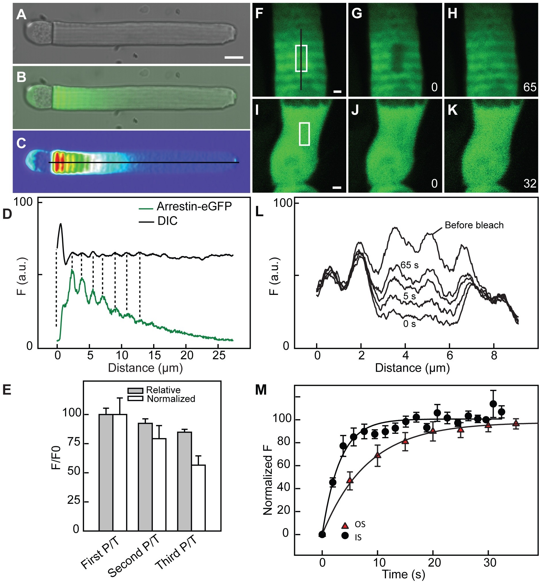 Figure 10. Axial variation of arrestin-eGFP transgenes in the OS. (AâE) A retinal explant from transgenic frogs expressing soluble arrestin- eGFP in rods was dark adapted and then moved to light for an hour before the live imaging. Arrestin-eGFP demonstrated axial variation in fluorescence at the base of the OS with a period of 1â1.4 mm that was synchronized with the DIC variation. The intensity profiles of the cell for both variations are shown (D). The intensity of the fluorescence decreased along the OS and the amplitude of the variation between peak (P) and neighboring trough (T) also decreased. The first peak was ,35% brighter than the next trough (N = 5 cells, p,0.03). Peak/trough ratios (P/T) were calculated for the first three light cycles closest to the base and then normalized to the first peak which was set 100% (Relative) and also after normalization to the mean (Normalized). Error bars represent standard deviation and each of the three bands were statistically different (N = 5 cells, ANOVA p,0.0003). (FâM) Fluorescence recovery after photobleaching. The light adapted rod with arrestin-eGFP in the OS (FâH, L) and IS (IâK) was photobleached within an area near the base of the OS (white box) in panels (F, I) and the fluorescence recovery of the photobleached area was recorded continuously. The intensity profile of this recovery along the black line in panel (F) is shown in panel (L) as a function of time. There is recovery after photobleaching within 65 seconds in the OS, regenerating the axial banding pattern with the same spatial period as neighboring regions. The IS arrestin-eGFP recovered faster that that in the OS. White bars are 1 mm. doi:10.1371/journal.pone.0080059.g010 |