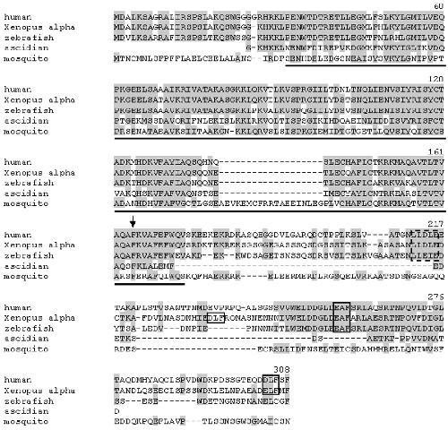 Sequence alignment of ARH homologues from different species. Conserved residues are shaded using the Boxshade program. The PTB domain is underlined, the DφF/W motifs are boxed, and the putative clathrin box is boxed with broken lines. The phenylalanine residue required for the interaction between hARH and LDLR is marked with an arrow. The complete ascidian sequence is not available. The GenBank™ accession numbers for the ARH homologues are as follows: zebrafish, BC045926; ascidian, AV384534; mosquito, AJ281467.