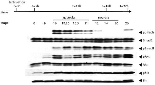 Figure 2. Kinetics of the activation of signalling molecules during early Xenopus development.X. laevis embryos were collected at the time indicated and subjected to Western blot analysis. Membranes were probed with anti-phospho-Smad1/5/8 (pSmad1) antibody for monitoring BMP activity, anti-phospho-Smad2 (pSmad2) antibody for TGF-β/Nodal signalling, anti-phospho-Erk (pErk) for MAPK/Erk signalling and anti-phospho-Akt (pAkt) for PI3K/Akt signalling. Anti- Smad2, anti- Akt, and anti-Erk were used as loading controls to ensure all lanes have been loaded equally. |
