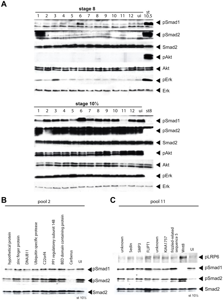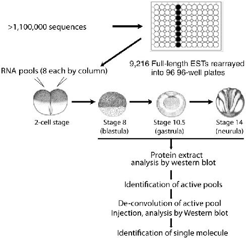Figure 3. Flowchart of the experimental procedure of the screen.A X. tropicalis library of unique, full-length clones has been established based on sequence comparison and clustering of over 1,220,000 ESTs, and rearrayed in a 96-well plate format. Pools of 8 mRNAs were prepared from pooled bacteria culture and in vitro transcription. Then in vitro transcribed mRNA pools were injected into fertilized X. laevis embryos at 1â2 cell stage. After microinjection, injected embryos were collected at stage 8 (blastula), stage 10.5 (gastrula), and stage 14 (neurula). Protein extracts from embryos were loaded onto SDS-PAGE for subsequent Western blot analysis. Antibodies used include anti-phospho-Smad1/5/8, anti-phospho-Smad2, anti-phospho-Akt, and anti-phospho-Erk. Once a potential active pool was identified, the pool was de-convoluted and single molecule injection was performed to identify the active molecule. |