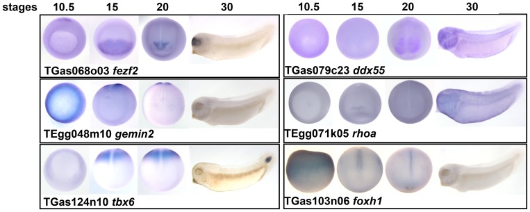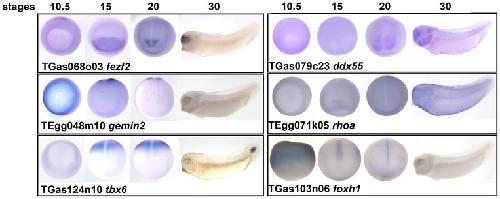 Figure 7. Whole-mount in situ hybridisation images on clones with regionalised expression patterns.For each clone the corresponding clone number and Xenopus gene symbol are shown. Vegetal view (stage 10.5 except for foxh1, which is side view); dorsal view (stage 15 and 20, posterior is up); lateral view (stage 30, anterior is to the left). |