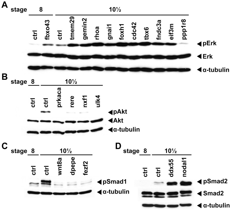 Figure 6. Results of the screen.The 20 active clones identified during the screen were individually injected and analysed by Western blot to demonstrate their abilities to modulate the activities of different signalling pathways as shown in Table 3. Embryos were collected at the indicated stages, processed, and analysed by Western blot to assess the activities of Erk (pErk, panel A), Akt (pAkt, panel B), BMP (pSmad1, panel C), and TGFβ/Nodal (pSmad2, panel D). Control (ctrl) denotes uninjected embryos. Anti-Erk (Erk), anti-Akt (Akt), anti-Smad2 (Smad2) and anti-α-Tubulin (α-Tubulin) were used as loading controls. |