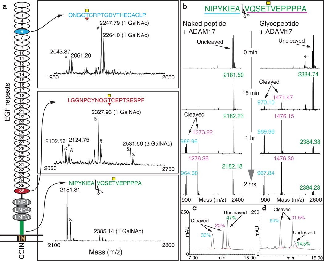 Figure 2. GALNT11 glycosylation of NOTCH1 derived peptides and effects on ADAM-mediated cleavagea) Depiction of NOTCH1 with MALDI-TOF spectra demonstrating O-GalNAc glycosylation of peptides derived from EGF6 (blue), EGF36 (magenta) and the juxtamembrane region (green). Yellow squares: O-GalNAc, Red triangles: O-Fuc. TM: transmembrane domain; NICD: Notch intracellular domain; # deammoniated peptide; & sodium adducts. b) MALDI-TOF time-course analysis of in vitro cleavage of the juxtamembrane peptide and glycopeptide by ADAM17. Scissors: Cleavage site. *nonspecific N-terminal degradation of two amino acids. c–d) HPLC analysis of the cleavage reactions with c) naked peptide and d) glycopeptide after 2 hrs (percentages above the peaks) with p<0.05 (two-tailed t-test).
