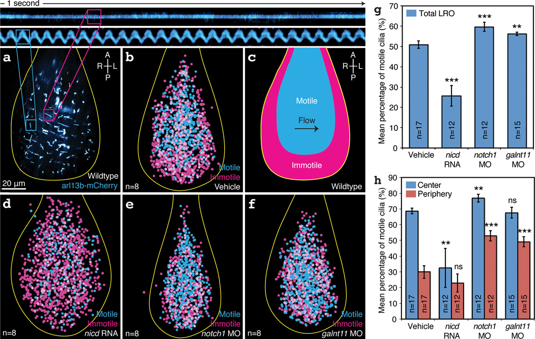 Figure 3. Galnt11/Notch signaling switches cilia between motile and immotile typesa) Wildtype LRO explants expressing arl13b-mCherry reveal distinct populations of immotile and motile cilia. Cyan box highlights a single motile cilium, with a corresponding kymograph analyzing beating frequency. Magenta box highlights immotile cilium and kymograph. b) Analysis of multiple vehicle LROs reveals a specific geography for cilia types: immotile cilia are enriched along the fringes, while motile cilia are enriched in the center. c) Schematic of a wildtype LRO A: anterior, P: posterior, L: left, R: right. d) nicd overexpressants exhibit a decrease in motile cilia in the center of the LRO. notch1 (e) and galnt11 (f) morphants display a decrease in immotile cilia along the LRO periphery. (g–h) Quantification of motile cilia distribution in total LROs (g), and in the center and along the periphery of the LRO (h). Bars depict means and error bars are standard error. b,d,e,f) n=8. g,h) vehicle n=17, nicd RNA n=12, notch1 MO n=12, galnt11 MO n=15. Additional details are in Methods.