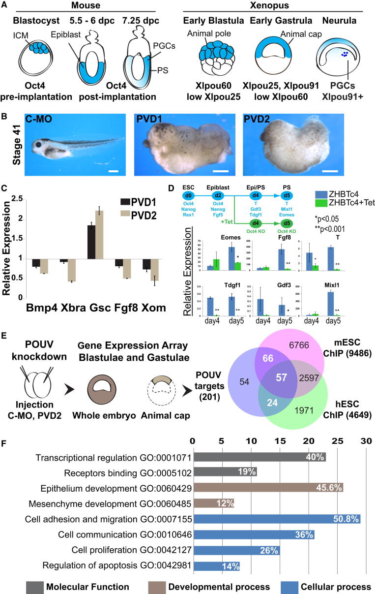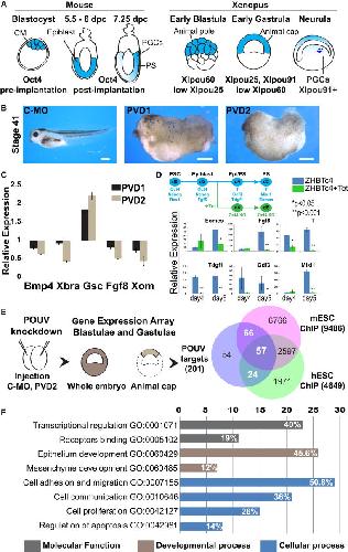 Figure 1. Identification of Conserved POUV Targets(A) Graphical representation of Oct4/POUV expression patterns in M. musculus and X. laevis.(B) POUV morphant phenotypes. Two-cell-stage embryos were injected with 120 ng of Control-MO or morpholino combinations; POUV-depleted (PVD), a mixture of Xlpou25, Xlpou60, and Xlpou91 MOs; and POUV-depleted-2 (PVD2), the same mixture but with a new Xlpou25 MO targeting both pseudoalleles of Xlpou25. Tadpoles were photographed at stage 41. The scale bar represents 0.5 mm.(C) qRT-PCR analysis of stage 10 embryos. Expression levels were normalized to Odc (ornithine decarboxylase) and are relative to the Control-MO. Data are shown as mean ± SD.(D) ZHBTc4 mESCs expressing Oct4 as a tetracycline (Tet)-suppressible transgene were differentiated to mesendoderm. Tet was added as indicated and qRT-PCR performed to monitor gene expression in differentiation. Expression is normalized to TBP and relative to ESCs. Data are shown as mean ± SD. p values were calculated by ANOVA test of minimum of four independent experiments.(E) POUV-dependent gene expression. Ectoderm (animal caps) from Control-MO and PVD2 embryos was dissected at early blastula stage (stage 8) and cultured until intact sibling embryos reached late blastulae (stage 9) and early gastrulae (stage 10) stages, as depicted. RNA from these explants was applied to Agilent 44K microarrays. POUV-regulated genes (N = 307) were identified by ANOVA analysis. Mammalian homologs (N = 201) of the POUV targets were identified by PSI-BLAST with minimum 60% identity. The Venn diagram shows the overlap of the genes regulated by POUV in Xenopus (N = 201) with global ChIP assays in murine and human ESCs.(F) Enriched Gene Ontologies of the targets conserved in mouse and human (N = 57) show the number of genes included in each GO term. White values on the bars show the percentage of genes included in the conserved targets list (N = 57).See also Figure S1 and Tables S1 and S2. |