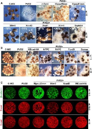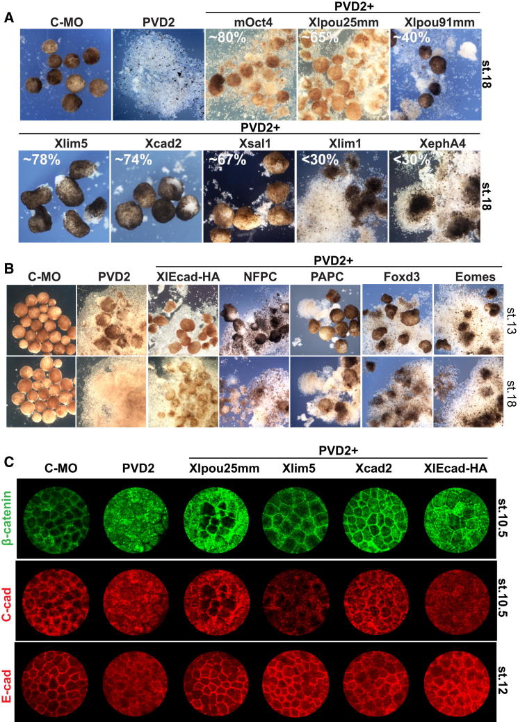 Figure 3. Rescue of Adhesion Phenotypes by POUV Targets (A) Rescue of ectoderm adhesion. Embryos were injected with 120 ng of Control-MO or PVD2 and 500 pg of mRNA encoding the indicated targets (1 ng for mOct4). Animal caps were cultured to neurula stage (stage 14). PVD2 animal caps displayed a dramatic loss of cell adhesion, which was rescued by murine Oct4 and by some of the conserved targets. Rescue index is reported as percentage of intact animal caps, and further details are summarized in Table S3. (B) Rescue of adhesion phenotypes before neurulation. Animal cap adhesion assay is as described in (A) and photographed at late gastrula (stage 13) and neurula (stage 18) stages. (C) Rescue of adherens junctions. Whole-mount immunofluorescence of embryos injected is as described in (A). Maximum intensity projections of confocal z stacks are shown. See also Figure S3 and Table S3. |