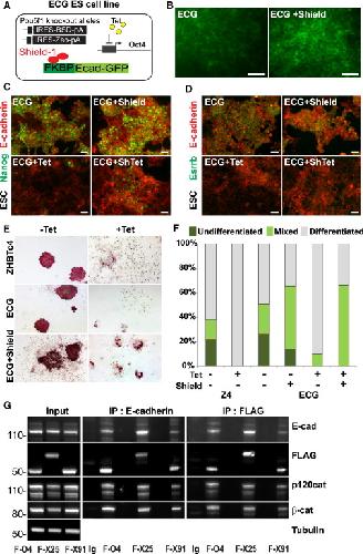 Figure 5. E-Cadherin Expression Partially Blocks ESC Differentiation(A) Schematic of ZHBTc4-derived inducible E-cadherin-GFP (ECG) rescue ESC line. Randomly integrated FKBP-E-cadherin-GFP was constitutively expressed from the CAG promoter.(B) Induction of E-cadherin-GFP with Shield-1. ECG ESCs were cultured under self-renewing conditions with or without Shield and imaged for GFP expression. The scale bar represents 50 μm.(C–D) Induction of E-cadherin in ECG cells supports low-level expression of Nanog (C), but not Essrb (D). Cells were cultured in the presence/absence of Shield and/or tetracycline and then fixed for immunofluorescence. The scale bar represents 50 μm.(E) E-cadherin supported limited AP-positive clonal growth of ESCs in the absence of Oct4. ECG ESCs were plated at clonal density in the presence/absence of Shield and/or tetracycline and colonies stained for tissue-nonspecific alkaline phosphatase (AP; red) after 7 days of growth.(F) Quantitation of clonal growth in ESCs supported by E-cadherin in place of Oct4. Colonies were scored as undifferentiated (dark green), mixed (light green), and differentiated (gray).(G) E-cadherin and POUV proteins interact. Postnuclear membrane fractions were purified from FLAG-tagged POUV-protein-rescued cell lines (see Figure 6) grown in self-renewing conditions. The figure shows immunoblot of coimmunoprecipitations, precipitating with either E-cadherin or the FLAG tag antibody. F-O4, FLAG-Oct4; F-X25, FLAG-Xlpou25; F-X91, FLAG-Xlpou91; Ig, IgG control.See also Figure S5. |