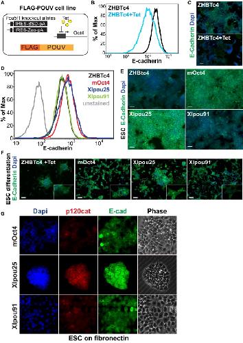 Figure 6. POUV Proteins Support Epithelialization and Antagonize EMT(A) The diagram shows rescue of ZHBTc4 ESCs with different FLAG-tagged POUV proteins. POUV proteins were introduced into these cells in the presence of tetracycline (Tet), and cell lines expressing similar and Oct4-like levels of POUV proteins were selected for further analysis. See also Figure S5A.(B–C) Downregulation of E-cadherin in response to Oct4 depletion in ZHBTc4 ESCs. ZHBTc4 ESCs were plated in self-renewing conditions in either the presence or absence of Tet and assessed by flow cytometry (B) or immunofluorescence (C). The scale bar represents 50 μm.(D–E) POUV- and, particularly, Xlpou25-rescued cell lines express localized E-cadherin. FLAG-POUV cell lines were cultured under self-renewing conditions and assessed by flow cytometry (D) or immunofluorescence (E). The scale bar represents 50 μm.(F) POUV- and, particularly, Xlpou25-rescued cell lines maintain normal epithelial morphology during mesoderm and endoderm differentiation. Immunofluorescence on cultures differentiated for 4 days. The scale bar represents 50 μm.(G) Xlpou25-supported ESCs are particularly resistant to the induction of EMT. ESC lines rescued by the indicated POUV protein were plated on fibronectin to stimulate EMT. Morphology and expression of E-cadherin and p120-catenin were assessed by immunofluorescence microscopy.See also Figure S5. |