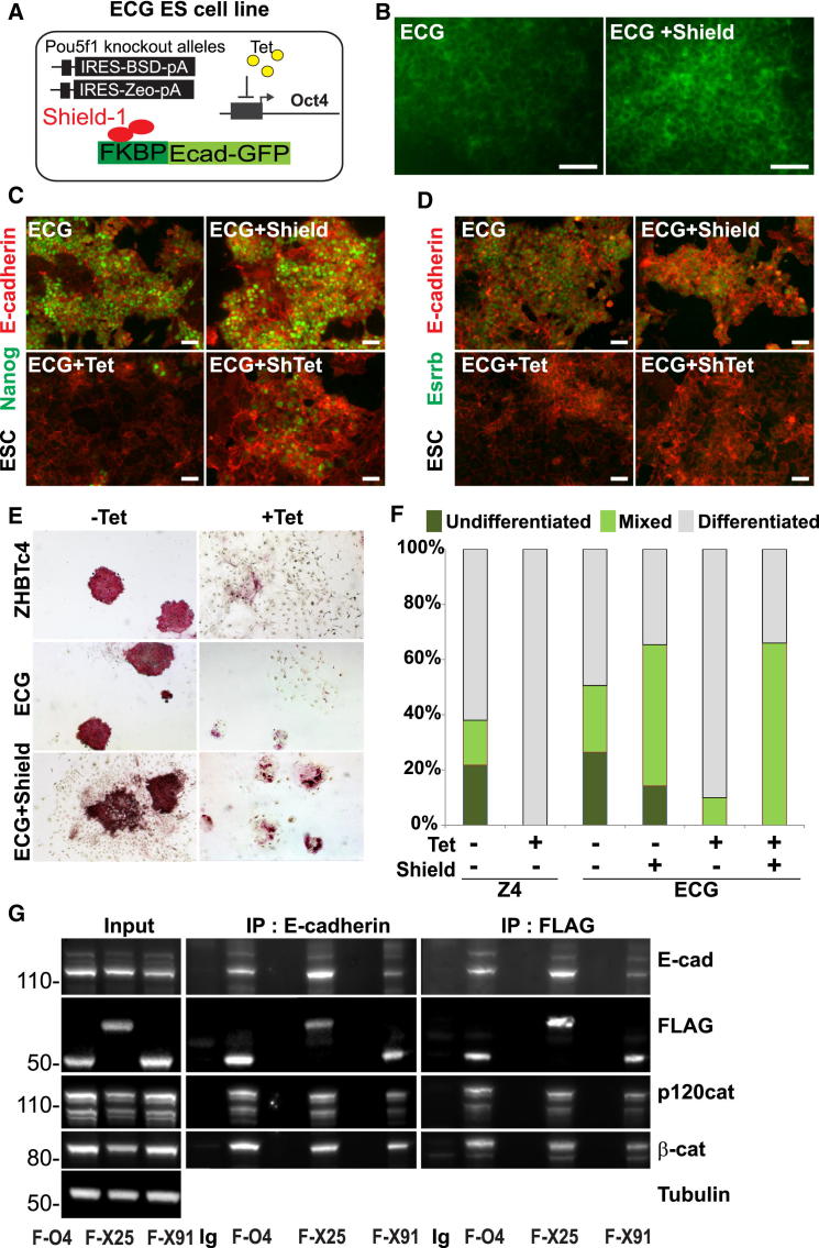 Figure 5. E-Cadherin Expression Partially Blocks ESC Differentiation (A) Schematic of ZHBTc4-derived inducible E-cadherin-GFP (ECG) rescue ESC line. Randomly integrated FKBP-E-cadherin-GFP was constitutively expressed from the CAG promoter. (B) Induction of E-cadherin-GFP with Shield-1. ECG ESCs were cultured under self-renewing conditions with or without Shield and imaged for GFP expression. The scale bar represents 50 μm. (CâD) Induction of E-cadherin in ECG cells supports low-level expression of Nanog (C), but not Essrb (D). Cells were cultured in the presence/absence of Shield and/or tetracycline and then fixed for immunofluorescence. The scale bar represents 50 μm. (E) E-cadherin supported limited AP-positive clonal growth of ESCs in the absence of Oct4. ECG ESCs were plated at clonal density in the presence/absence of Shield and/or tetracycline and colonies stained for tissue-nonspecific alkaline phosphatase (AP; red) after 7 days of growth. (F) Quantitation of clonal growth in ESCs supported by E-cadherin in place of Oct4. Colonies were scored as undifferentiated (dark green), mixed (light green), and differentiated (gray). (G) E-cadherin and POUV proteins interact. Postnuclear membrane fractions were purified from FLAG-tagged POUV-protein-rescued cell lines (see Figure 6) grown in self-renewing conditions. The figure shows immunoblot of coimmunoprecipitations, precipitating with either E-cadherin or the FLAG tag antibody. F-O4, FLAG-Oct4; F-X25, FLAG-Xlpou25; F-X91, FLAG-Xlpou91; Ig, IgG control. See also Figure S5. |