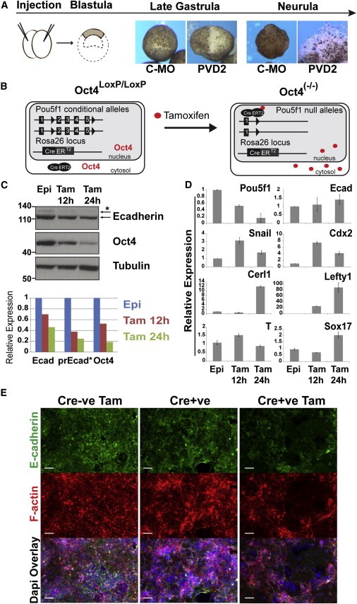 Figure 2. POUV Depletion Phenotypes in Xenopus Ectoderm and EpiSCs(A) POUV morphant ectodermal explants exhibit adhesion defects. Animal caps were excised from stage 8 blastulae injected with Control-MO or PVD2 and cultured until either late gastrula or neurula stage (stage 14). PVD2 morphant explants were slow to round up and never properly healed; by the completion of neurulation, PVD2 explants completely disaggregated.(B) Diagram of the Oct4LoxP/LoxP-EpiSC lines. These cells possess two conditional Pou5f1 alleles and express an inducible Cre recombinase. Addition of tamoxifen induces Cre-mediated Oct4 deletion.(C) Immunoblot of samples from Oct4LoxP/LoxP and Oct4(−/−)-EpiSC 12 and 24 hr after tamoxifen treatment (0.1 μM). The bottom panel shows quantified chemiluminescent signals normalized to tubulin and relative to untreated EpiSCs. Pr-Ecad is the precursor of E-cadherin, indicated by the starred arrow.(D) qRT-PCR of Oct4LoxP/LoxP-EpiSCs 12 and 24 hr after tamoxifen addition. Expression was normalized to TBP, relative to untreated EpiSCs. Bars show mean ± SD.(E) Immunofluorescence of Cre-negative (Cre-ve) and Cre-positive (Cre+ve) Oct4LoxP/LoxP-EpiSCs 48 hr after tamoxifen treatment. The scale bar represents 50 μm.See also Figure S2. |