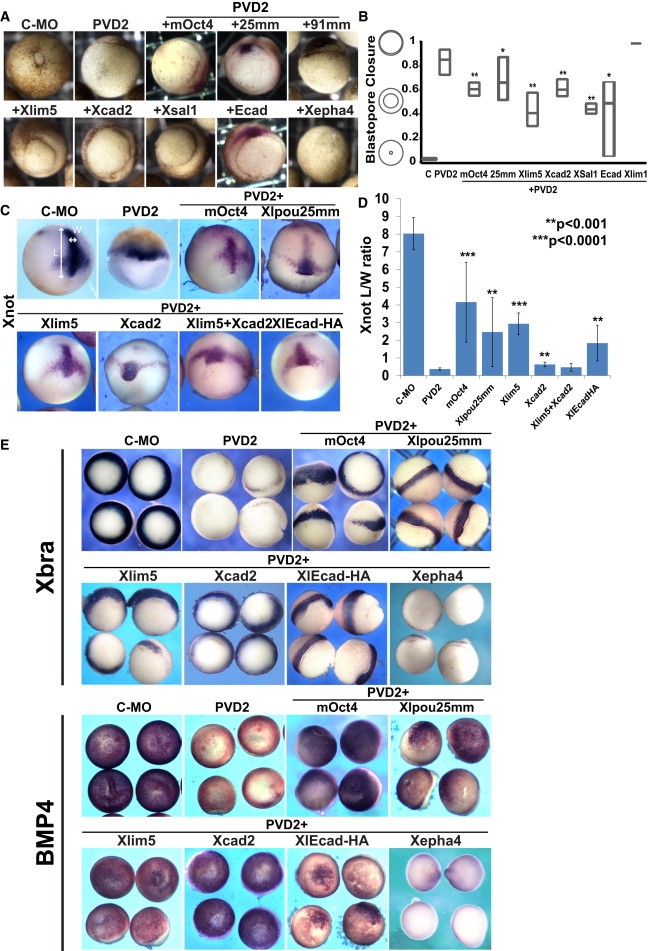 Figure 4. POUV Targets Rescue PVD2 Embryonic Phenotypes (A) Rescue of blastopore closure. Photographs are of whole embryos at stage 12, injected as previously described. (B) Quantification of blastopore rescue. Blastopore closure was estimated at stage 12 using the ratio of blastopore diameter to embryo diameter. The Xlim1 value was arbitrarily set to 1. Box plot shows maximum and minimum values, and the line represents the mean. p values were calculated by nonparametric ANOVA test with multiple comparison corrections (âp < 0.05, ââp < 0.001). (C) Rescue of convergent extension defect in PVD2 morphants. In situ hybridization for the dorsal midline marker Xnot at stage 12 was used to evaluate convergent extension in PVD2 morphants and rescued embryos [ 40]. (D) Quantification of convergent extension based on the length/width ratio of Xnot (as shown by double arrows on Control-MO). Bars show mean ± SD. p values were calculated as described in (B). ââp < 0.001; âââp < 0.0001. (E) Progenitor state gene expression was rescued by POUV targets. In situ hybridization for Xbra, vegetal view, and Bmp4, animal view, in PVD2 morphants is shown. See also Figure S4. |