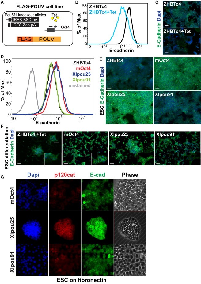 Figure 6. POUV Proteins Support Epithelialization and Antagonize EMT (A) The diagram shows rescue of ZHBTc4 ESCs with different FLAG-tagged POUV proteins. POUV proteins were introduced into these cells in the presence of tetracycline (Tet), and cell lines expressing similar and Oct4-like levels of POUV proteins were selected for further analysis. See also Figure S5A. (BâC) Downregulation of E-cadherin in response to Oct4 depletion in ZHBTc4 ESCs. ZHBTc4 ESCs were plated in self-renewing conditions in either the presence or absence of Tet and assessed by flow cytometry (B) or immunofluorescence (C). The scale bar represents 50 μm. (DâE) POUV- and, particularly, Xlpou25-rescued cell lines express localized E-cadherin. FLAG-POUV cell lines were cultured under self-renewing conditions and assessed by flow cytometry (D) or immunofluorescence (E). The scale bar represents 50 μm. (F) POUV- and, particularly, Xlpou25-rescued cell lines maintain normal epithelial morphology during mesoderm and endoderm differentiation. Immunofluorescence on cultures differentiated for 4 days. The scale bar represents 50 μm. (G) Xlpou25-supported ESCs are particularly resistant to the induction of EMT. ESC lines rescued by the indicated POUV protein were plated on fibronectin to stimulate EMT. Morphology and expression of E-cadherin and p120-catenin were assessed by immunofluorescence microscopy. See also Figure S5. |